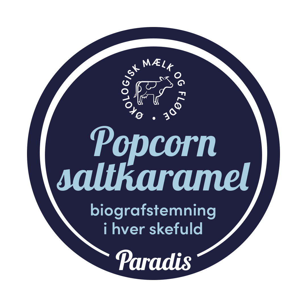 Økologisk ismix (SØDMÆLK°, FLØDE°, rørsukker°, SKUMMETMÆLKSPULVER°, glukose°, dextrose°, stabilsator E412° E410°; °=økologisk), Saltkaramel med popcornsmag (sukker, glukosesirup, vand, modificeret stivelse, salt, aroma; kan indeholde spor af ÆG, MÆLK, SOJA, MANDEL, HASSELNØD, VALNØD og PISTACIENØD), Saltkaramel med karamelliserede popcorn (raps- solsikke- og palmeolie, sukker, karamelsukker, karamelpopcorn (sukker, majskerner, glukosesirup, SMØR, salt, aroma, karamelsirup, emulgator E322 SOJALECITHIN, MÆLKEPULVER, SKUMMETMÆLKSPULVER, sprød karamel (sukker, glukosesirup, vand, SMØR, FLØDE, salt, hævemiddel E500), glucosesirup, maltodextrin, aromatisk karamel (sukker, glukosesirup, SMØR, FLØDE), emulgator E322 SOJALECITHIN, aroma; kan indeholde spor af ÆG, MANDEL, HASSELNØD, VALNØD, CASHEWNØD, PISTACIENØD, SESAM og JORDNØD), Dextrose